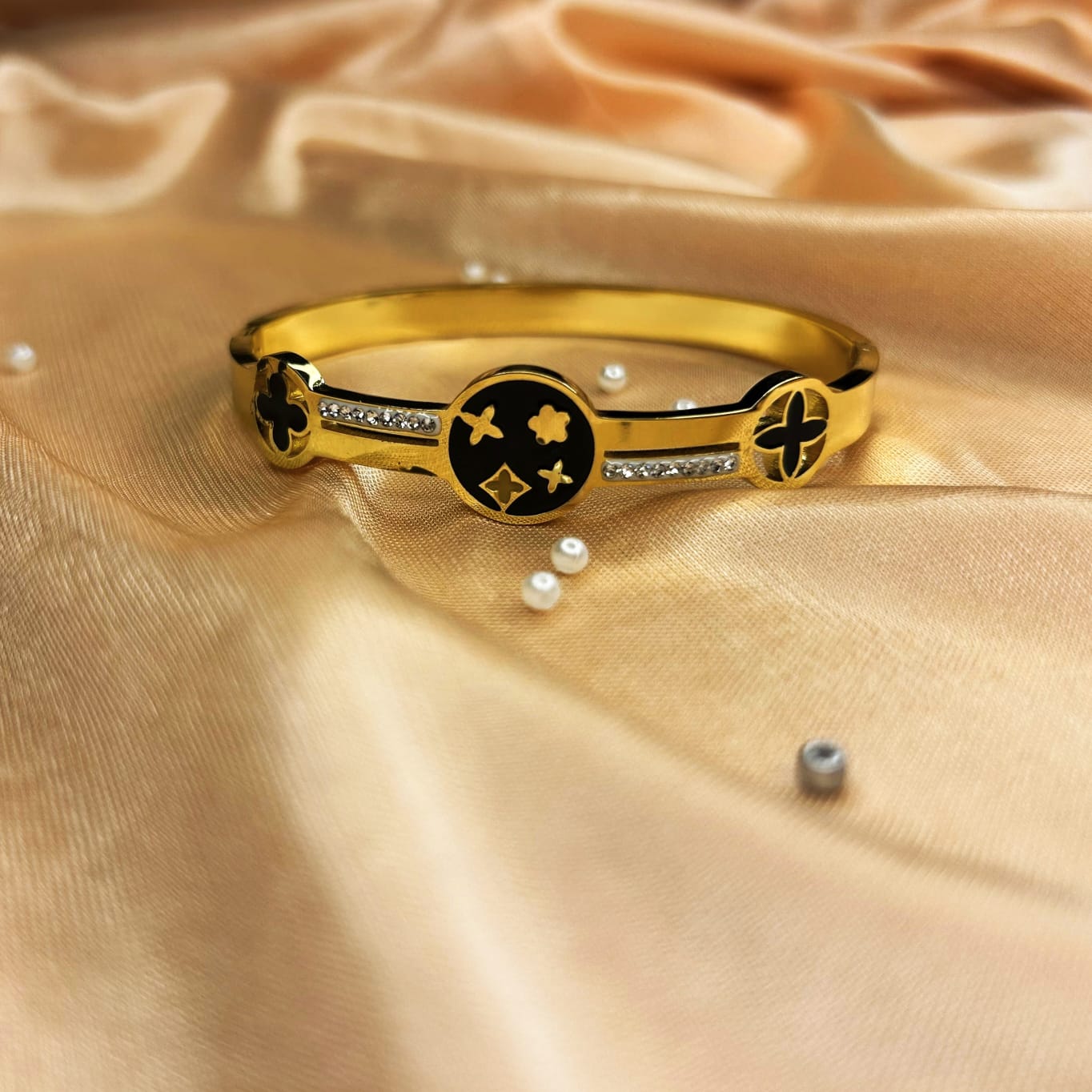 A striking gold-toned bracelet featuring a black enamel clover-inspired centerpiece with subtle stone accents. Finished with an anti-tarnish coating for long-lasting shine, it blends modern elegance with everyday durability.