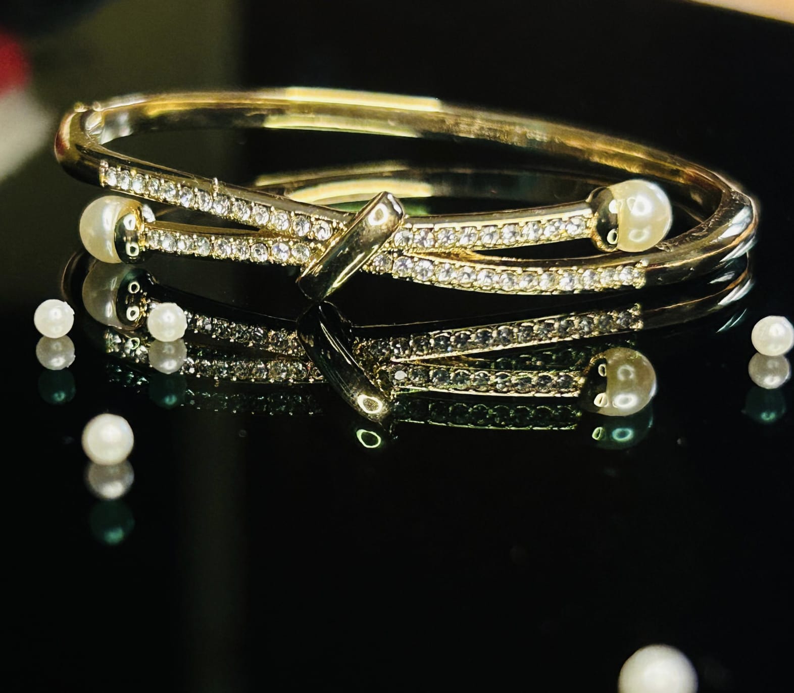 An elegant gold-finish bracelet accented with luminous pearls and sparkling stones. Designed with an anti-tarnish coating to retain its shine, it adds a refined touch to both everyday and festive looks.